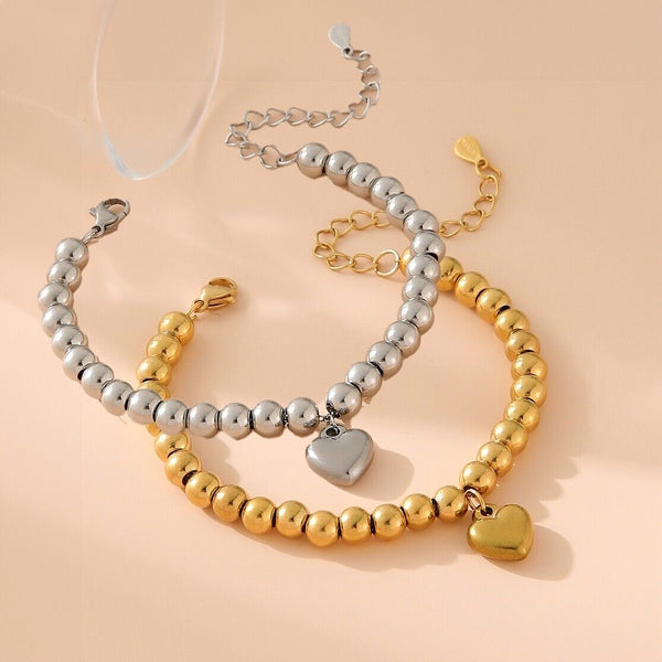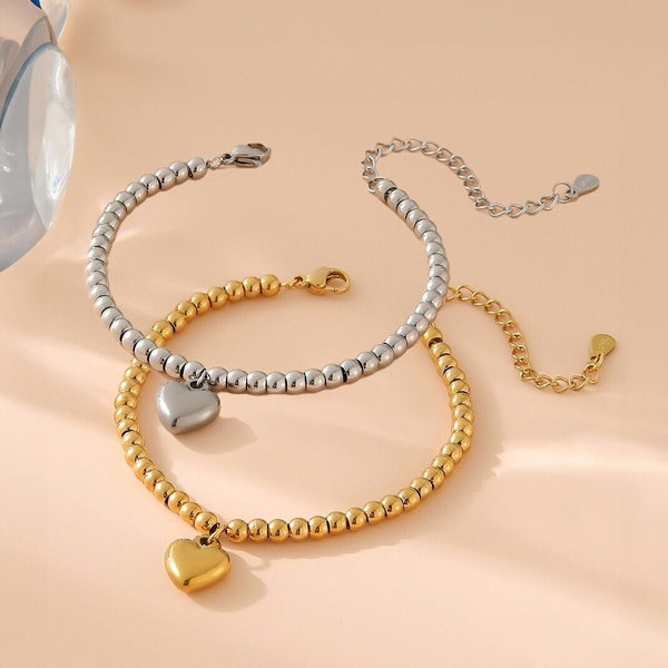 14K Gold Plated Stainless Steel Bracelet Heart Bead Beaded Adjustable Silver T16