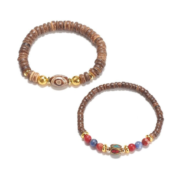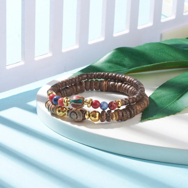2Pcs 2 Style Mala Bead Bracelets Set, Natural Coconut & Gemstone Stretch Bracelets Set with Tibetan Style DZi Beads for Women,