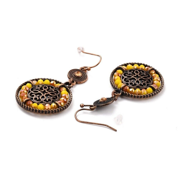 Bohemia Vintage Flat Round Dangle Earrings, Spakling Rhinestone Drop Zinc Alloy Earrings for Women, Red Copper, Yellow