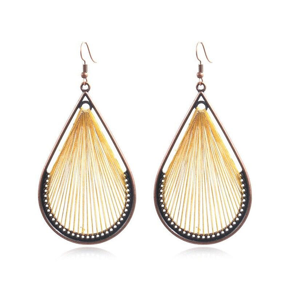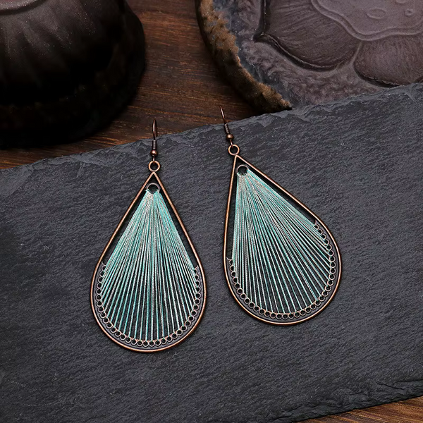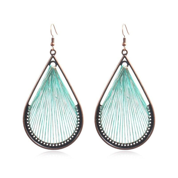 Bohemia Style Alloy Dangle Earrings, with Cotton Thread and Metallic Cord, Teardrop, Red Copper, Aquamarine and Gold