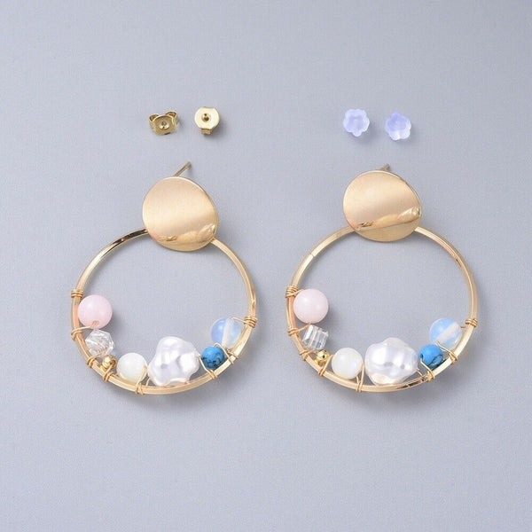 Plastic Imitation Pearl Dangle Earrings, with Glass Beads, Natural & Synthetic Gemstone Beads, Sea Shell Beads and Brass Ear Stud Findings, Golden