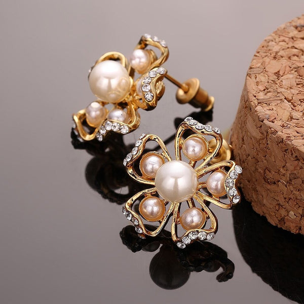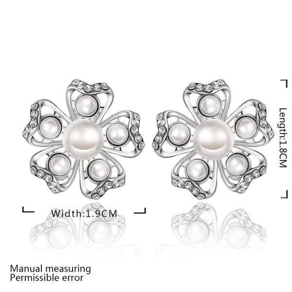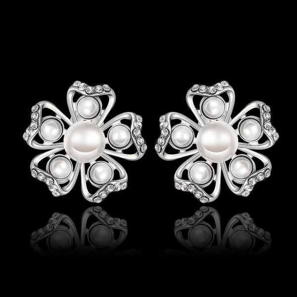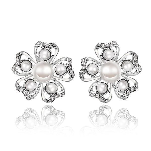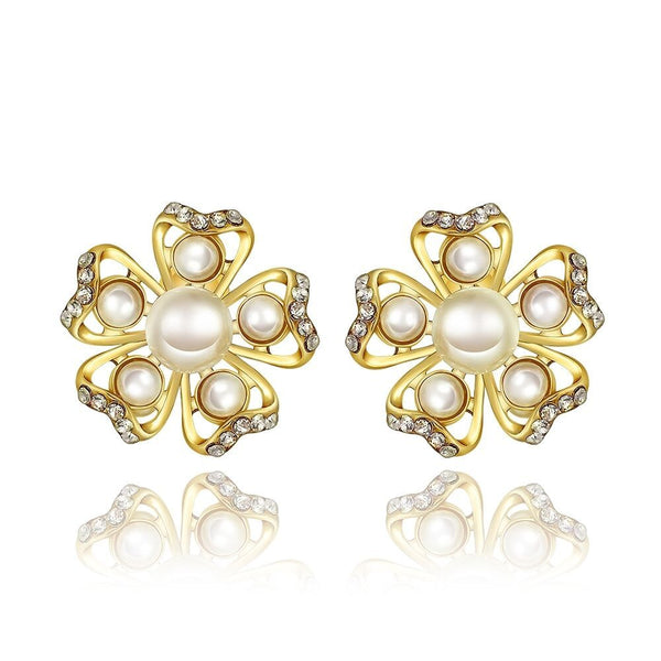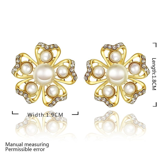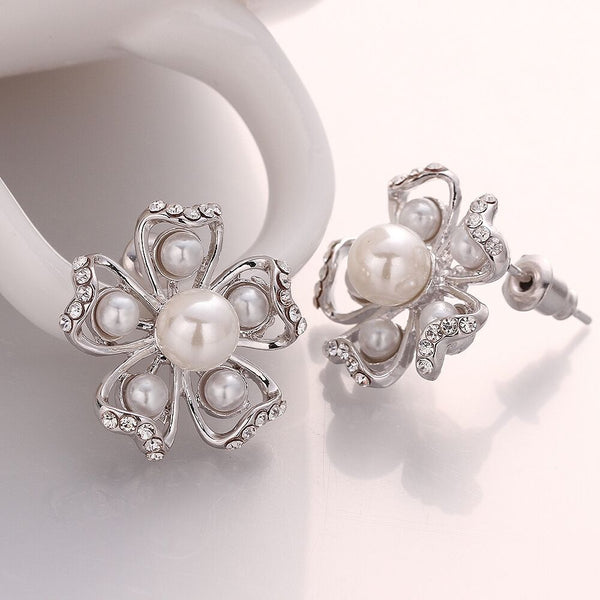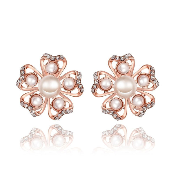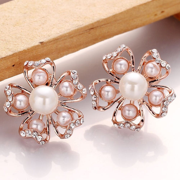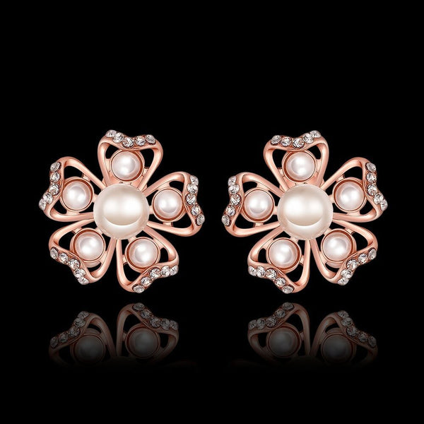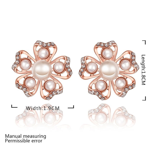 Rose Gold Platinum Plated Earrings Pearl AAA Zirconia Push Back Flower .76" L326