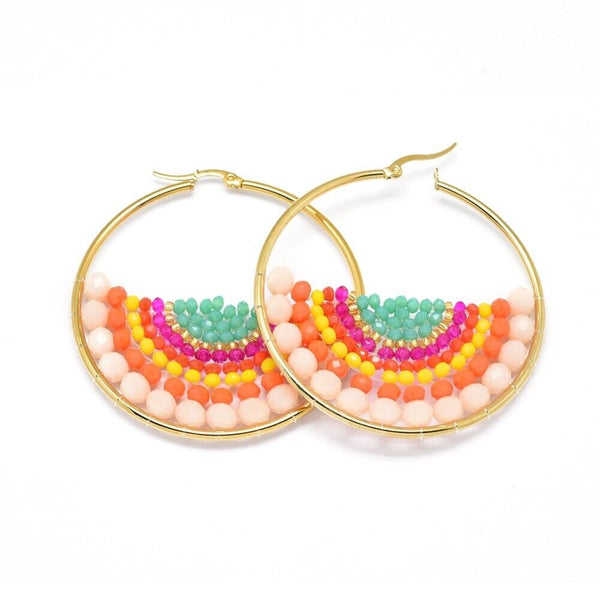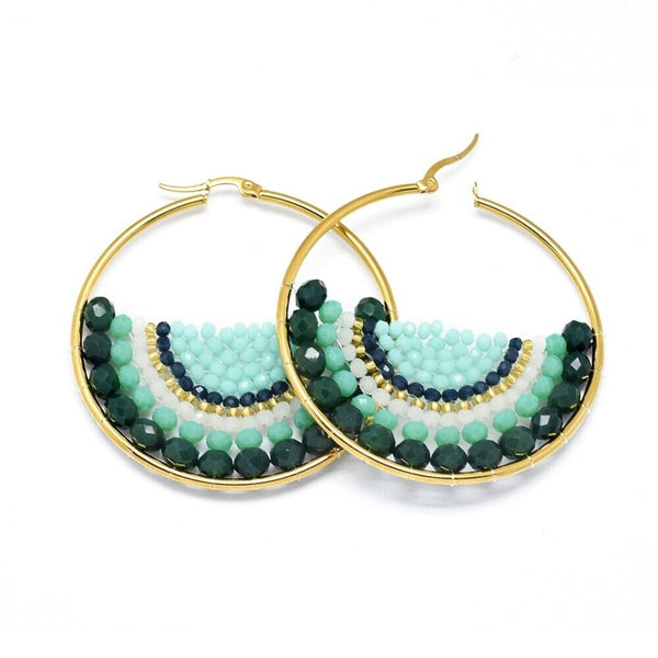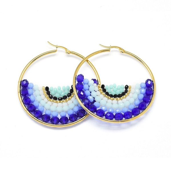 Stainless Steel Hoop Earrings Glass Beads Black Gold Blue Green 56x54x56mm P347