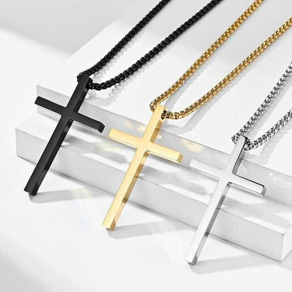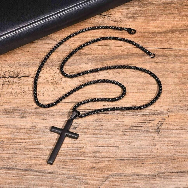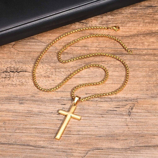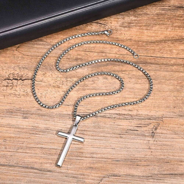 Men's Stainless Steel Cross Pendant Box Chain Necklaces, Stainless Steel Color