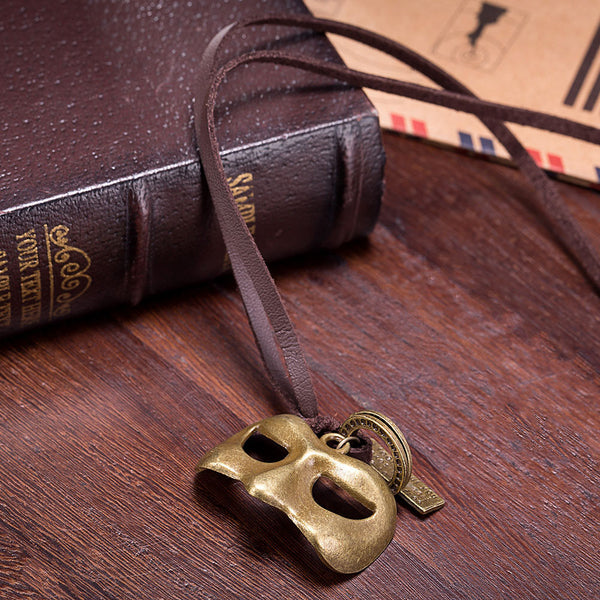 Genuine Leather Necklace Pendant Masquerade Mask Adjustable Slide Clasp B484