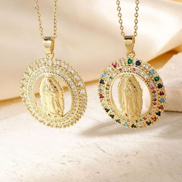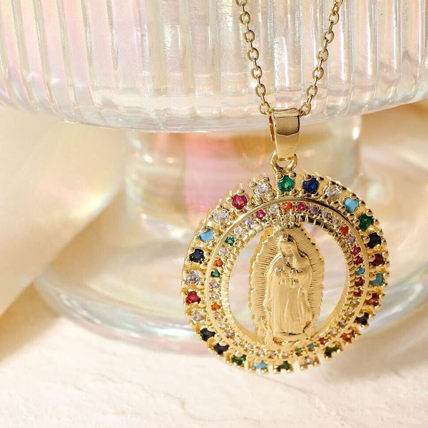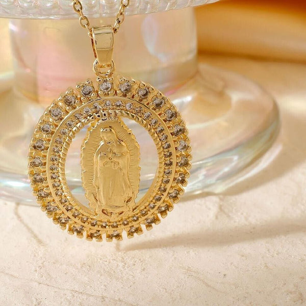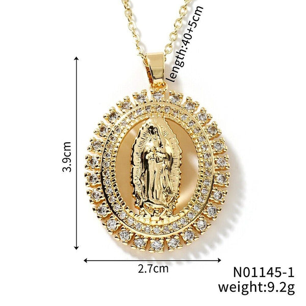 Brass Shiny Cubic Zirconia Virgin Mary Pendant Necklaces, Fashion Hip-hop Rock Jewelry Accessory, Gold.