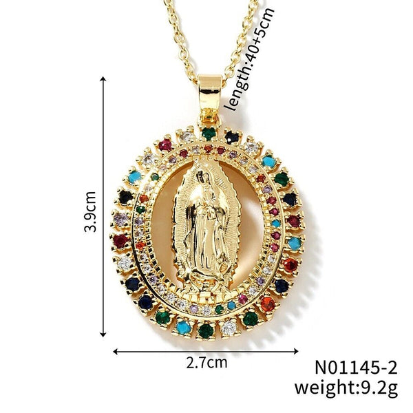 This European and American style Virgin Mary shining zircon necklace pendant is a fashionable and hip-hop rock accessory. The necklace is made of copper and comes in a stunning gold color. With a weight of 9 grams, this necklace is lightweight and comfortable to wear. The pendant features a sparkling zircon stone in the shape of the Virgin Mary, adding a touch of elegance and sophistication to any outfit. This necklace is perfect for adding a touch of glamour to your everyday look or for dressing up for a special occasion. With its unique design and high-quality materials, this necklace is sure to become a favorite in your jewelry collection. Add a touch of sparkle and style to your wardrobe with this stunning zircon necklace pendant.