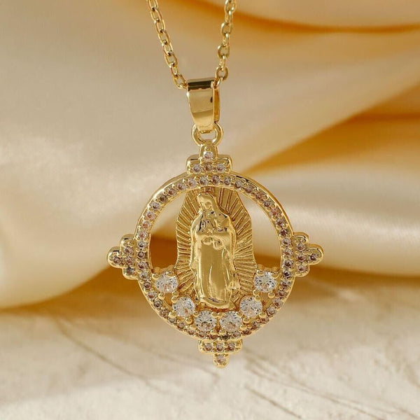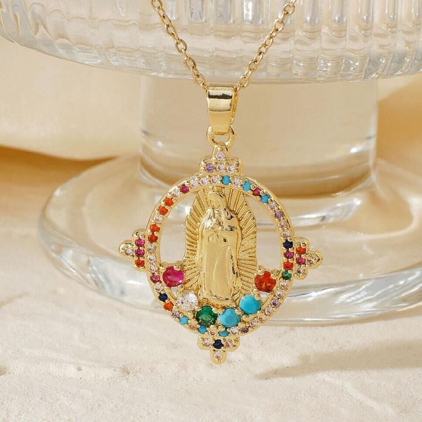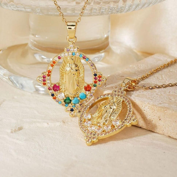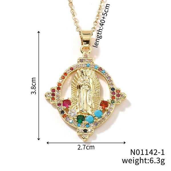 Gold Plated CS Zirconia Guadalupe Virgin Mary Necklace Pendant Multicolor N35