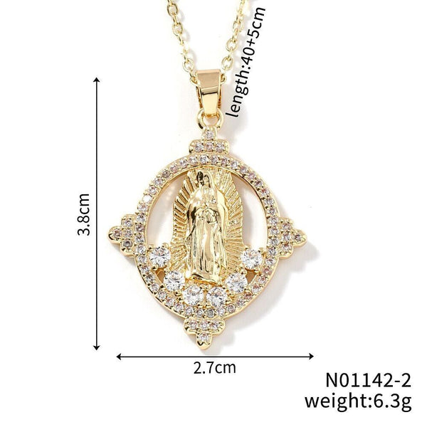 This European and American style Virgin Mary shining zircon necklace pendant is a fashionable and hip-hop rock accessory. The necklace is made of copper and comes in a stunning gold color. With a weight of 9 grams, this necklace is lightweight and comfortable to wear. The pendant features a sparkling zircon stone in the shape of the Virgin Mary, adding a touch of elegance and sophistication to any outfit. This necklace is perfect for adding a touch of glamour to your everyday look or for dressing up for a special occasion. With its unique design and high-quality materials, this necklace is sure to become a favorite in your jewelry collection. Add a touch of sparkle and style to your wardrobe with this stunning zircon necklace pendant.