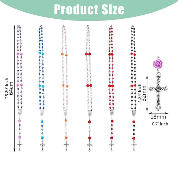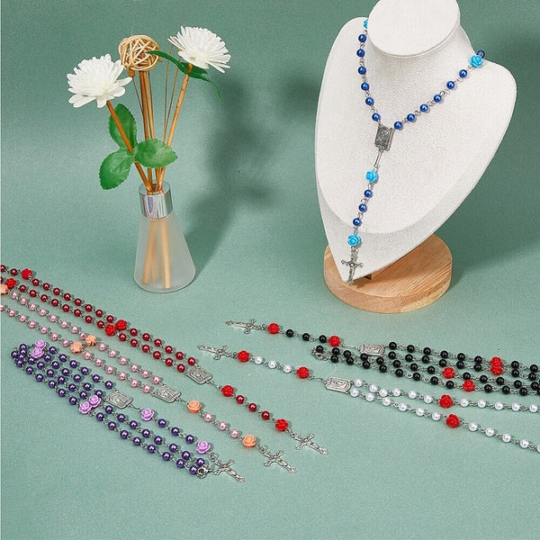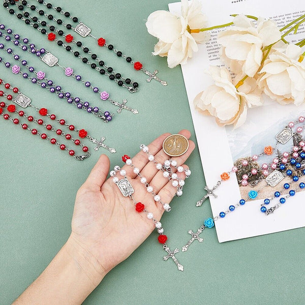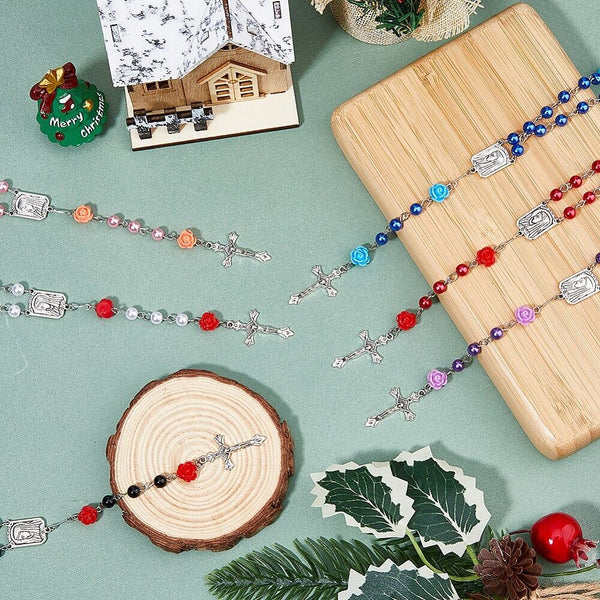 Imitation Pearl Acrylic & Resin Rose Rosary Bead Necklaces Set, Tibetan Style Alloy Crucifix Cross Pendant Necklaces, Mixed Color